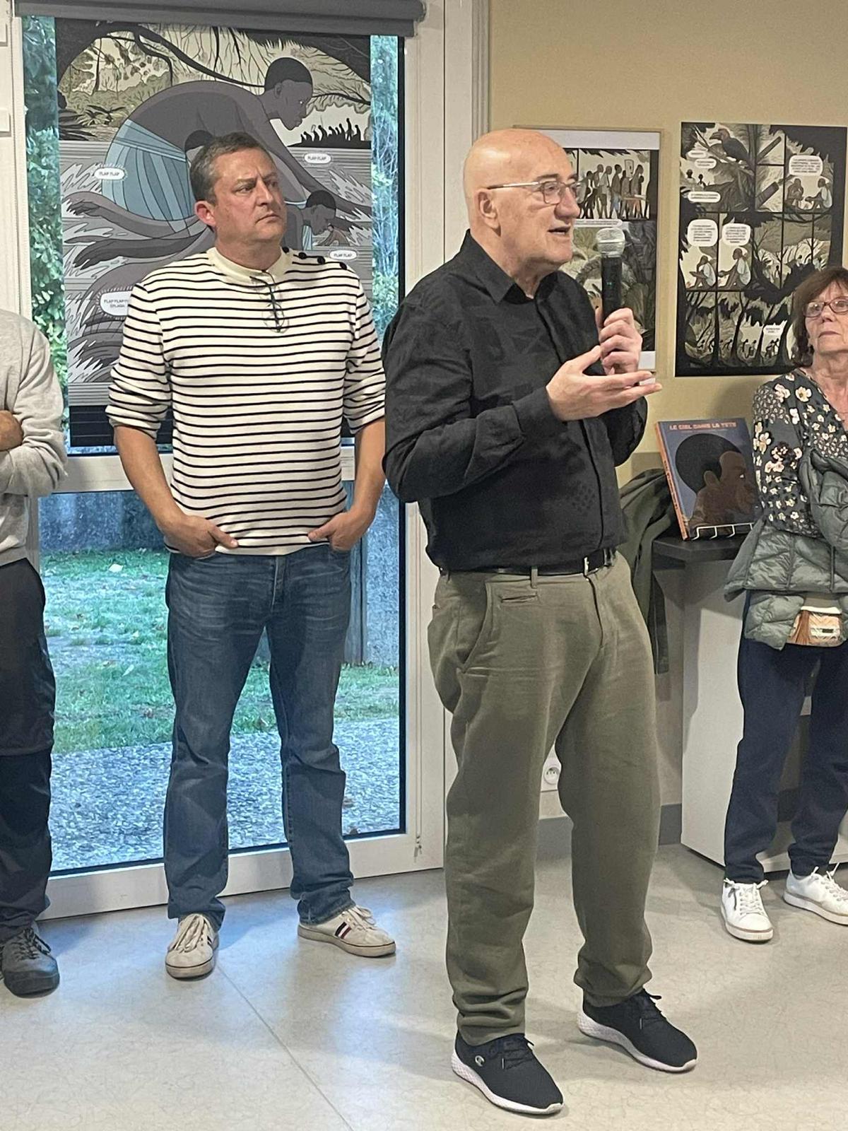 À la médiathèque d’Agonac, le Festival avait l’immense privilège et honneur d’accueillir jeudi soir l’auteur espagnol Antonio ALTARRIBA, l’un des plus talentueux scénaristes de la bande dessinée contemporaine. Son dernier livre, « Le ciel dans la tête », bouleversant récit retraçant le parcours du jeune Nivek, enfant soldat fuyant le Congo avec l’espoir de rejoindre l’Europe, nous plonge dans une ambiance dure, parfois atroce, mais parsemée de lueurs d’espoir : l’amitié, l’amour, la poésie, toutes choses systématiquement mises à mal… et pourtant si essentielles à la vie. Une rencontre passionnante avec un grand humaniste et un chef-d’œuvre à découvrir de toute urgence. L’exposition est à découvrir jusqu’au 8 novembre.